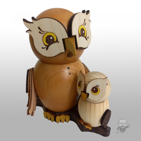 Eule mit Einsatz für Räucherkerzen und EulenkindMaterial: HolzGröße: 17 x 9 x 16cm (B/T/H)